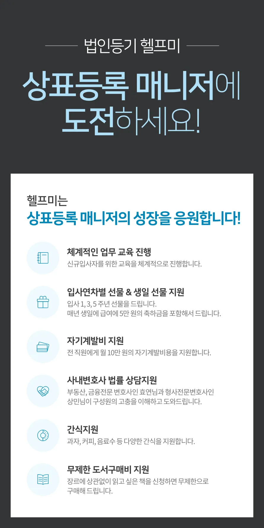 헬프미가 추구하는 인재상은 어제보다 나은 오늘, 오늘보다 나은 내일을 만들어가는 사람입니다. 이러한 인재상을 실현하기 위해 상표 분야 문제에 대해 연구하고 있습니다.